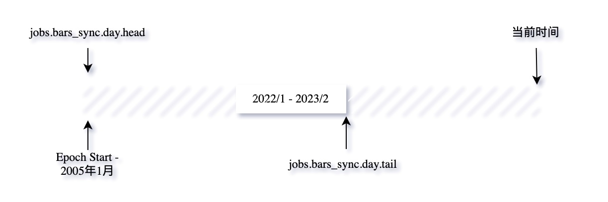 我们通过epoch_start,sync head,sync tail指针(在redis数据库中,db1)及当前时间来确定已经同步的数据范围,和需要同步的数据范围,见上图。在我们发布zillionare的容器时,我们将sync head设置为了epoch_start,因此,一旦您配置了聚宽账号,数据同步将优先补齐从2022年12月30日之后到现在的数据。等到这部分数据追赶完成之后,您可以修改redis数据库中的头指针,使之与influxdb中数据的实际起点重合。这样,Zillionare将利用您每天剩余的quota来向后补齐数据,只到数据补齐到epoch_start(即2005年1月4日为止)。您也可以在同步一定量的数据之后,如果不需要更早的数据了,可以将该指针再次改回到epoch_start以结束同步。