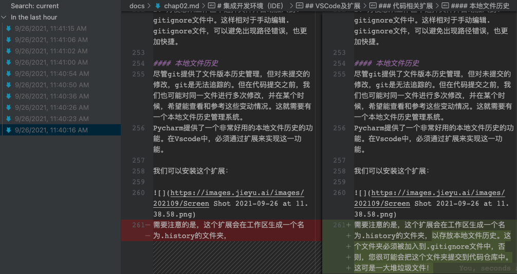 Pycharm 提供了一个非常好用的本地文件历史的功能。在 VS Code 中,必须通过扩展来实现这一功能。