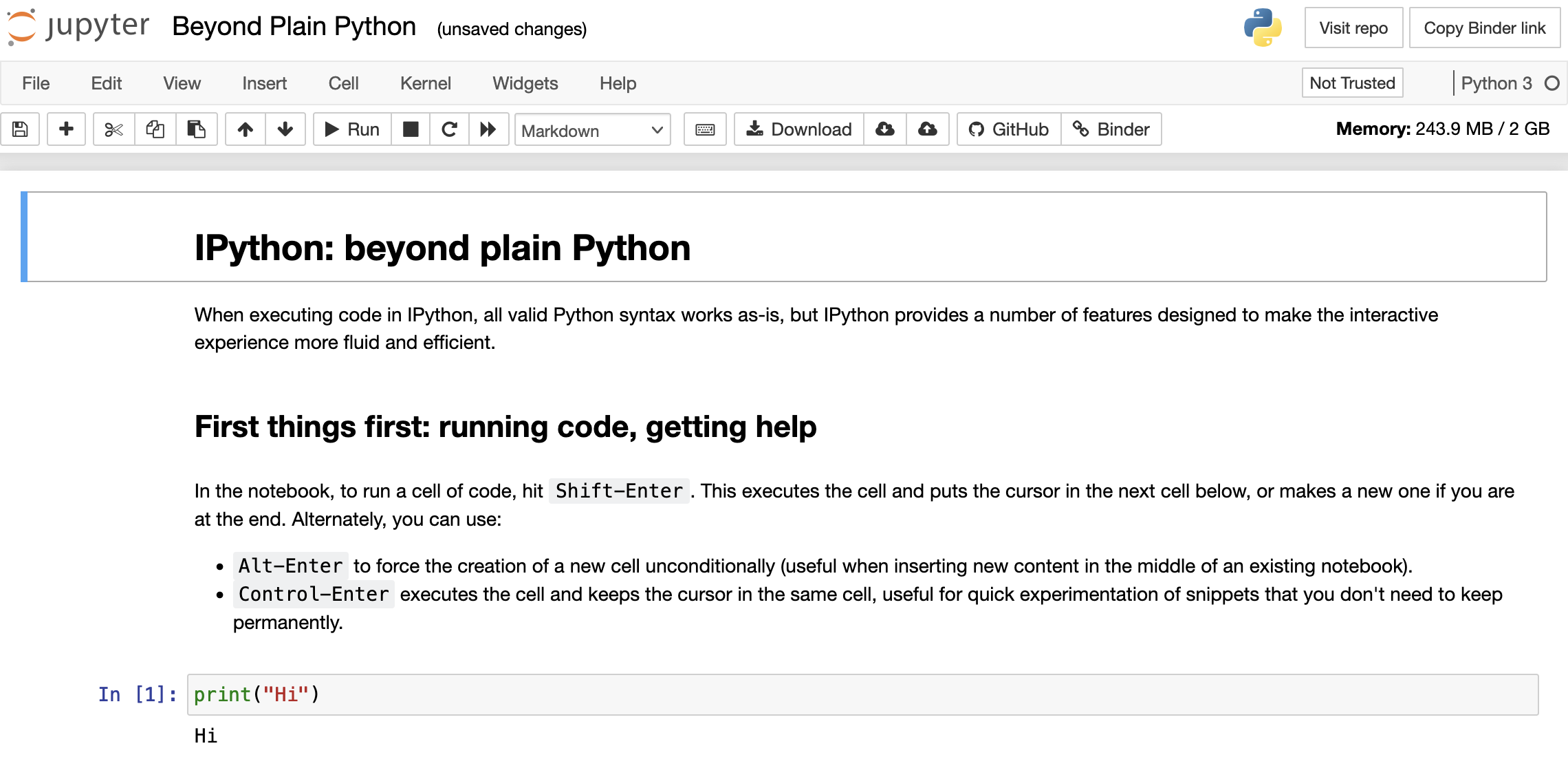 一个正在运行的 Notebook 可以看成是一个进程,在此 Notebook 中的代码单元格里定义的变量和函数都具有全局作用域,每个代码单元格都可以单独执行。这种模式有它极其方便的一面,你可以随时随地在 Notebook 中运行代码,并且可以在不同的代码单元格中进行切换--无论是探索数据的特性,还是探索一个新的程序库的功能,都变得非常容易。