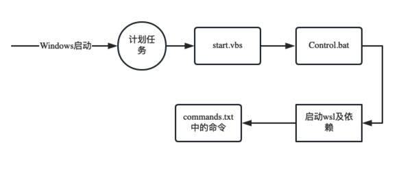我们需要写三个脚本,一个 start.vbs,一个 control.bat 和一个 commands.txt,并且增加一个开机自动执行的计划任务。当 Windows 开机后,这个计划任务自动执行,调用 start.vbs 来执行 control.bat, 而 control.bat 则会启动 WSL(及其依赖的 Windows 服务),并在 WSL 环境下执行定义在 commands.txt 中的那些命令--即将要在 WSL 中运行的服务,比如 ssh server。整个过程如下图所示:
