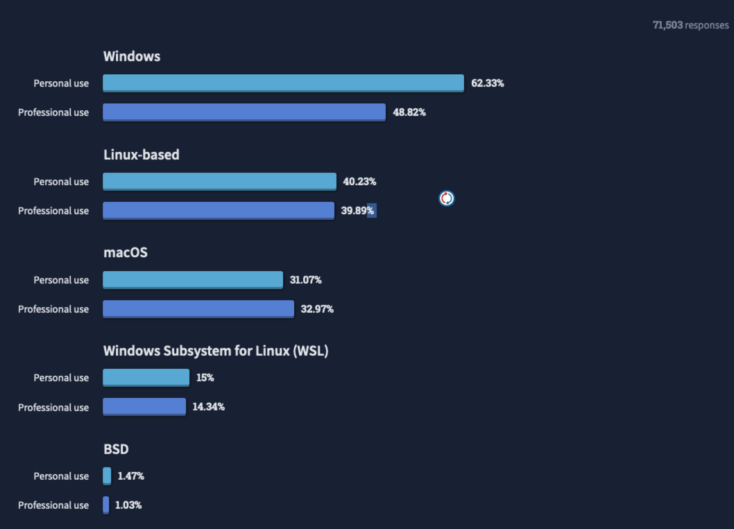 每一项右边的数字,表明在受调查者中,有多少人(百分比)在使用该操作系统。从图中可以看出,如果把 Linux 自身的使用量与 WSL 的使用量(WSL 是一种 Linux)加在一起,专业使用者的占比已经达到了 54.23%,超过使用 Windows 作为开发平台的专业使用者(48.82%),Linux 已经是排名第一的操作系统。