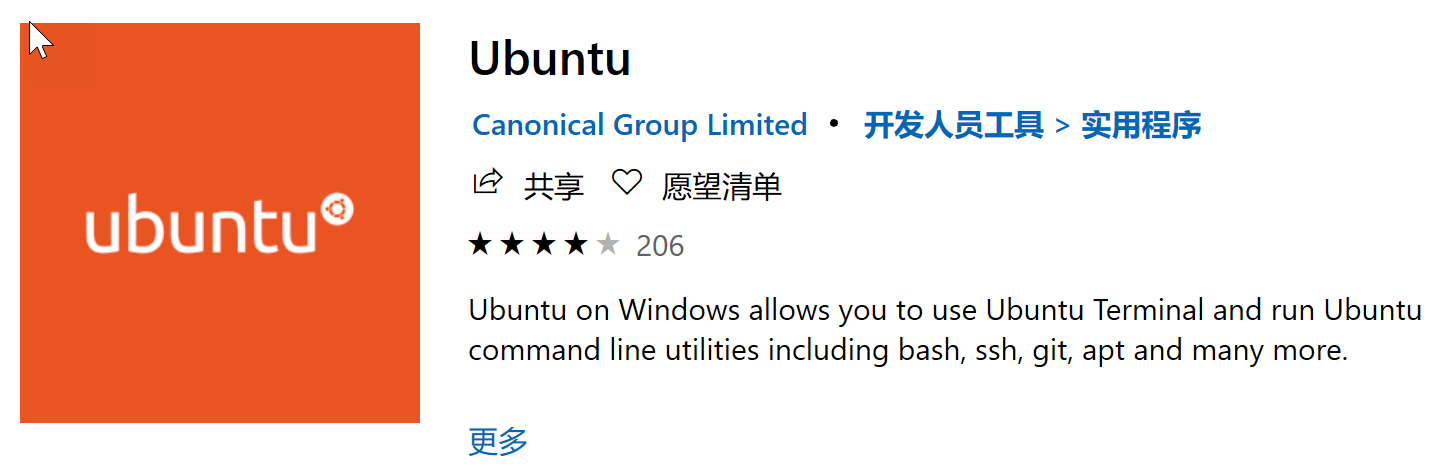 - 从 Windows 应用商店搜索安装一个 Linux 发行版,在这里的示例中,我们使用 Ubuntu: