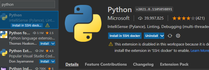 这是一个非常有用的扩展,是微软官方开发的扩展之一。它可以让你在 VS Code 中直接打开远程机上的文件夹,编辑并调试运行。如果您使用过 Pycharm 等 IDE,就会知道,尽管这些 IDE 也支持远程开发,但它们是在本地创建文件,调试运行前先要上传同步到远程机器上。频繁同步不仅降低了效率,而且也常常出现未能同步,导致行为与预期不一致,浪费时间查找问题的情况。这也是也是 VS Code 优于 Pycharm 的一个重要特性。