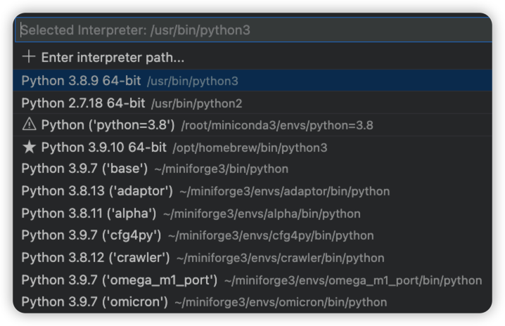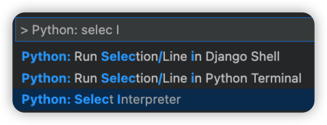 在 VS Code 中,打开命令面板(在 mac 下是 cmd+shift+p, 其它操作系统中是 ctrl + shift + p),输入 Python: select Interpreter,如下图所示: