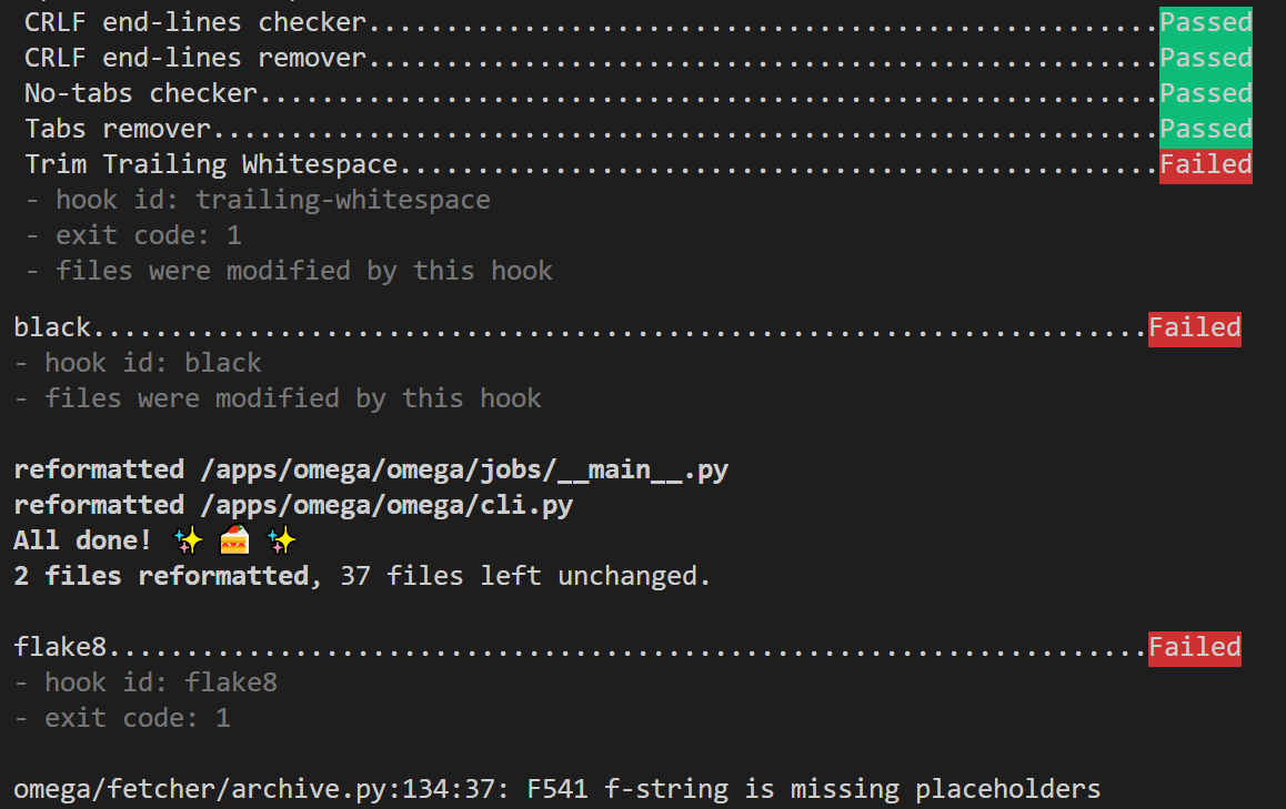 可以看出,pre-commit hooks 对换行符进行了检查和修复,调用 black 进行了格式化,以及调用 Flake8 进行了查错,并报告对 f-string 的错误使用。
