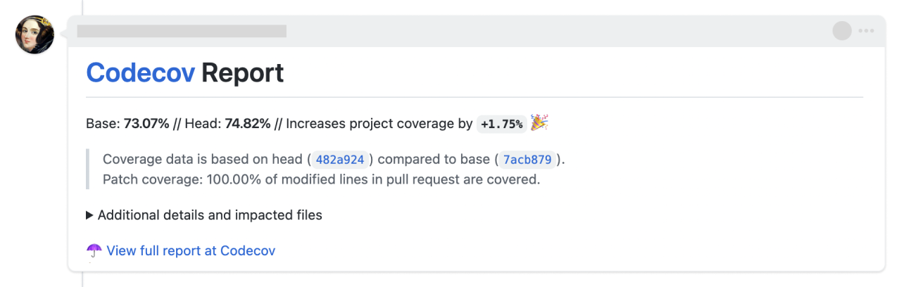 并且还能在 pull request 的注释中看到覆盖率的变化: