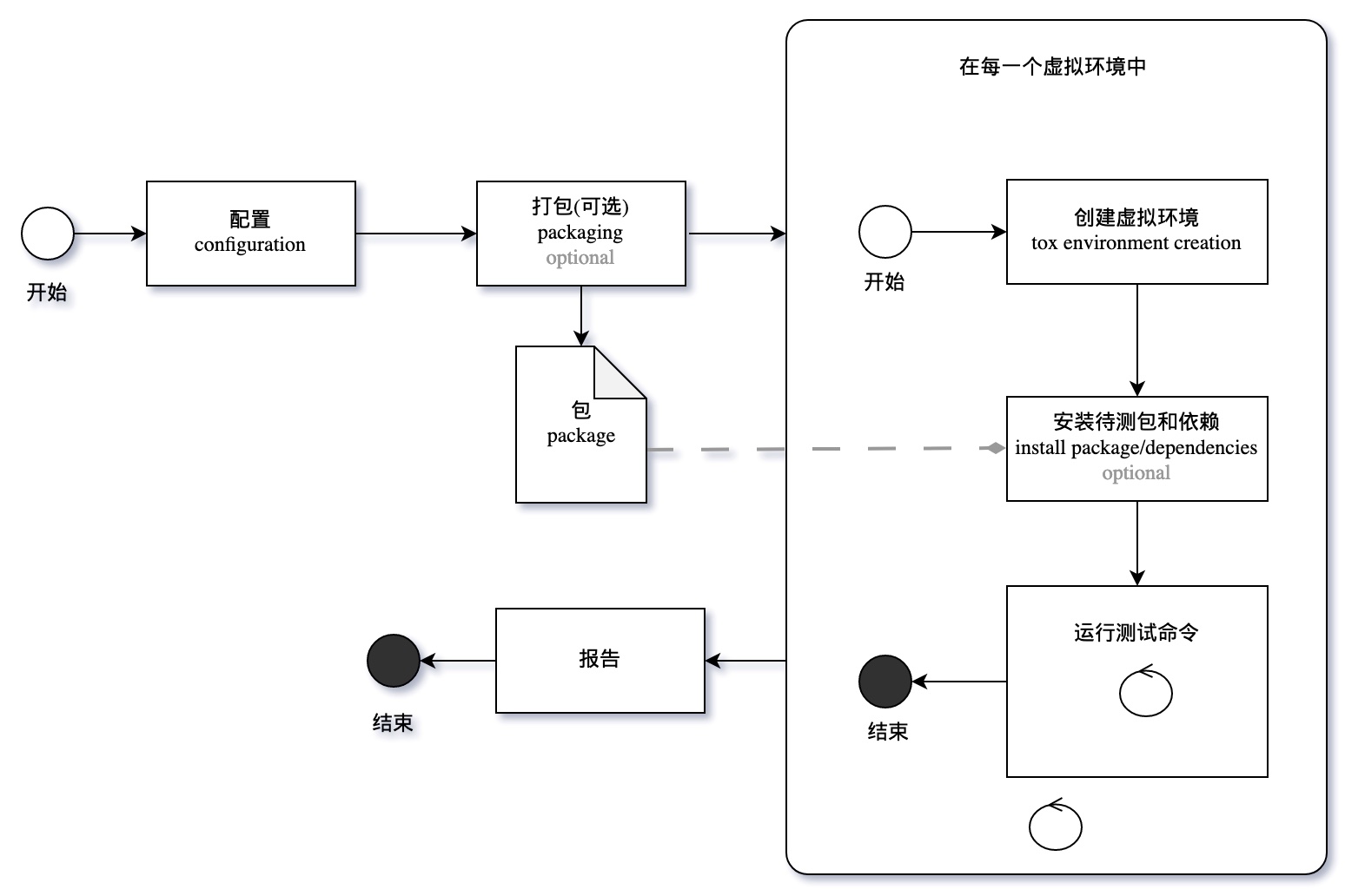 根据这张图,tox 读取配置文件,打包待测试软件,按照配置文件创建虚拟环境,并安装待测试软件和依赖,然后依次执行测试命令。最终,当所有虚拟环境下的测试都通过后,tox 会生成测试报告。