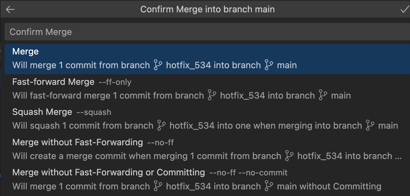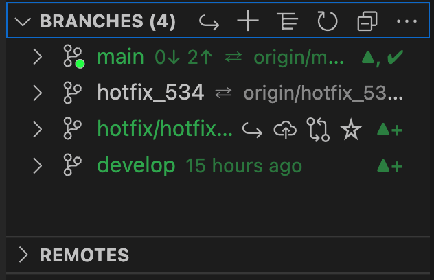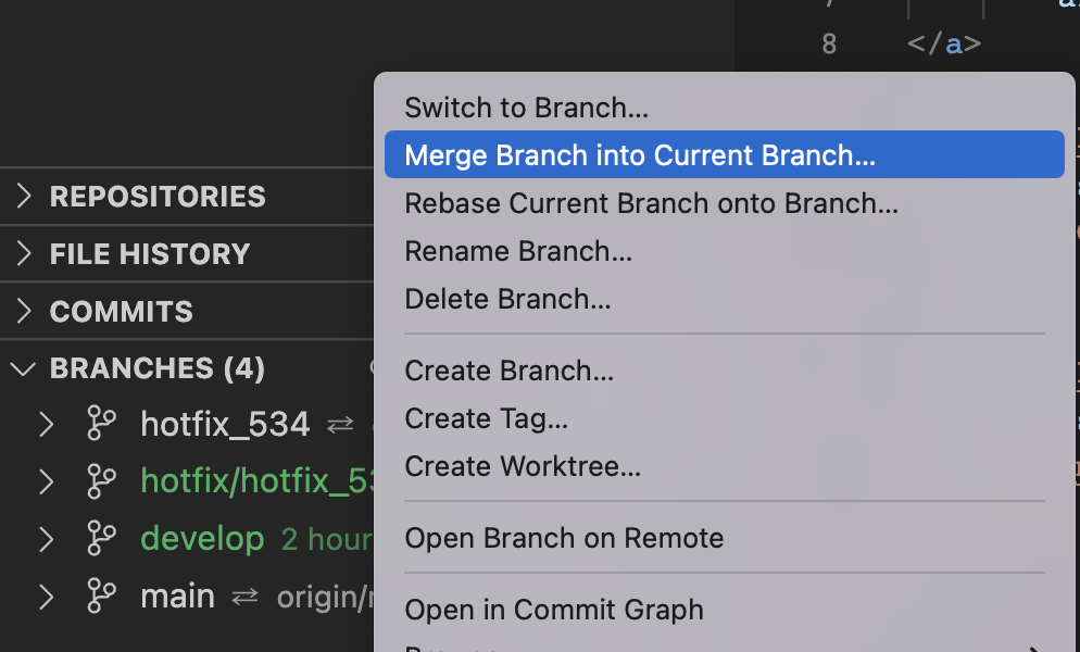 首先,我们将 c4 从 hotfix_534 分支上 merge 回 main 分支。我们要先切换到 main 分支,再在下面的界面中,将鼠标移动到 hotfix_534 那个条目上,再右键唤出上下文菜单,如下图所示: