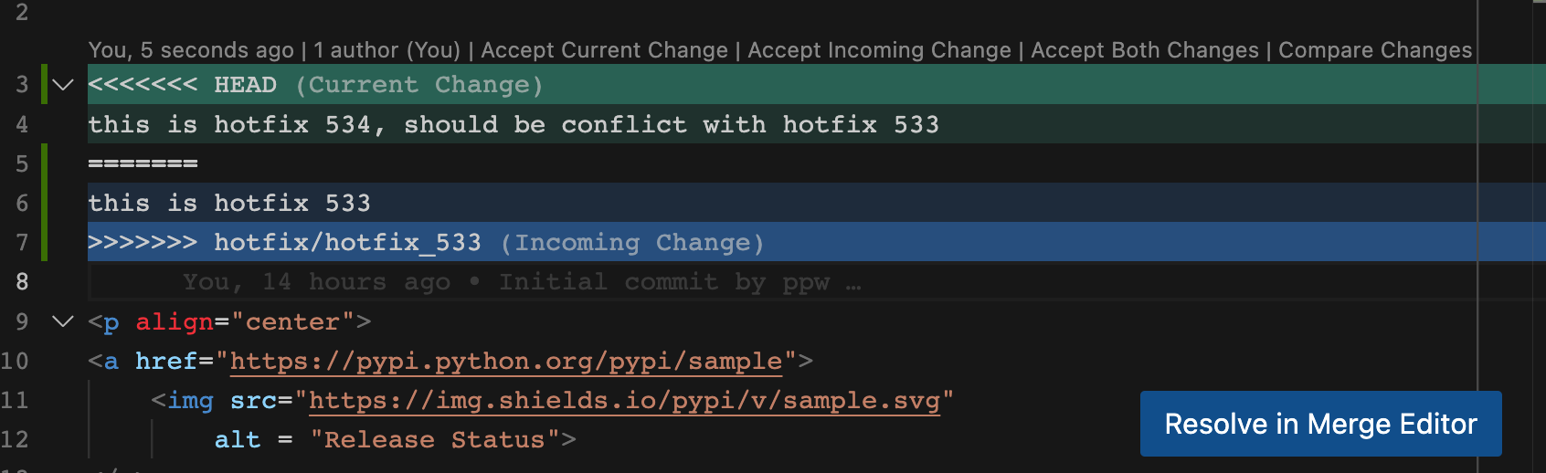 左边的是 hotfix_533 分支,右边的则是 main 分支,两个改动相互冲突。如果我们接受 hotfix_533,则可以点击顶部的"Accept Incoming"按钮,如果我们接受 main 分支,则可以点击底部的"Accept Current"按钮。如果我们希望保留两个分支的改动,则可以点击中间的"Accept Combination"按钮,将两个修改同时保留。我们也可以全部拒绝两个修改,这样只需要编辑下面的 result 窗口中对应行(图中的第 3 行)就行了。