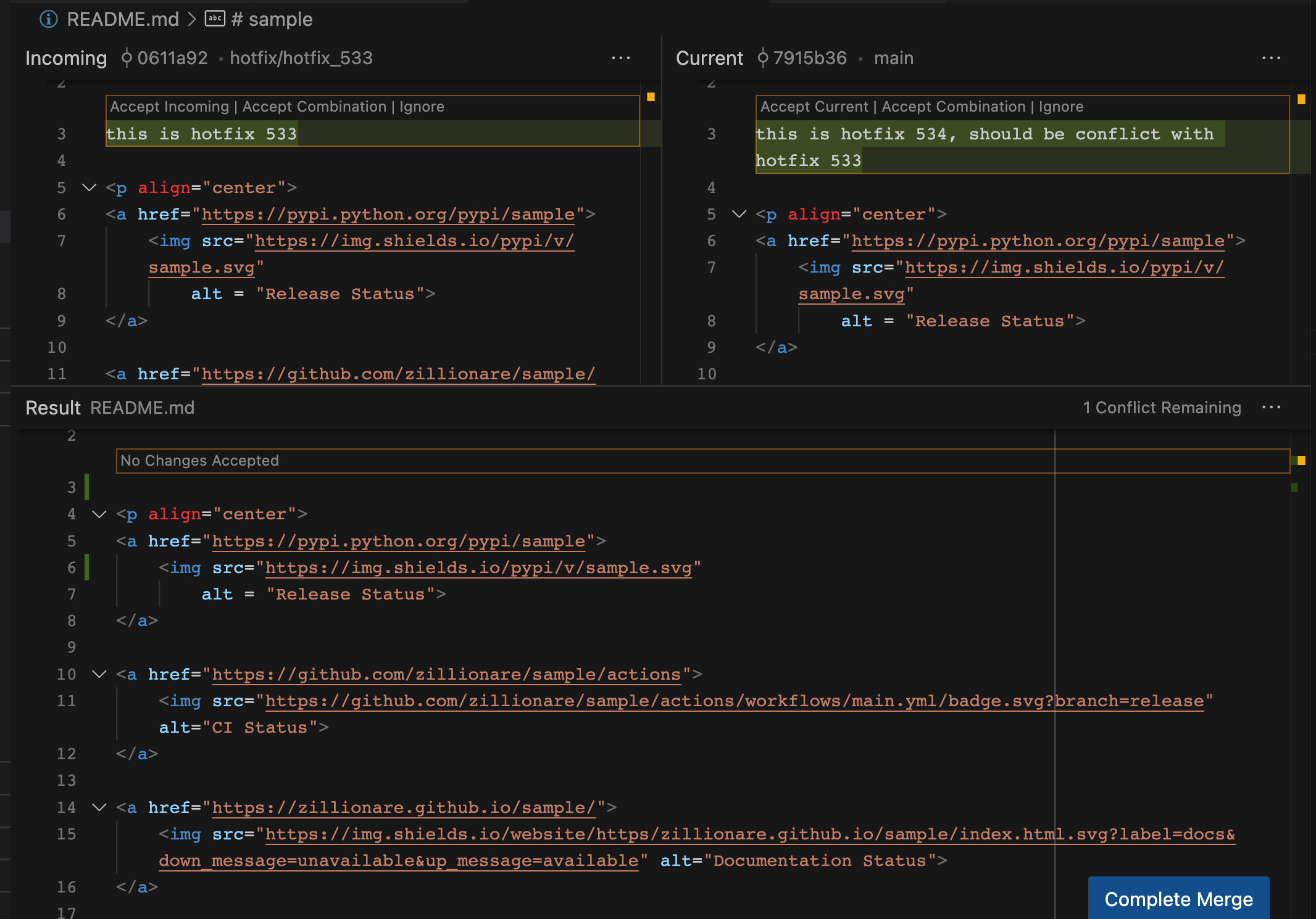 当一个文件中的所有冲突都被解决之后,点击“Complete Merge”按钮关闭编辑器,完成合并。