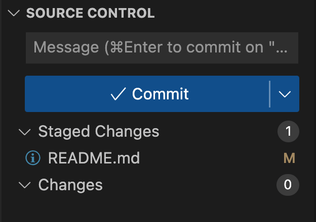 此时在 vscode 侧面板上,我们可以看到 README.md 文件出现在 changes 类别下(注意 vscode 使用的术语与 git 不同,这是可以理解的),