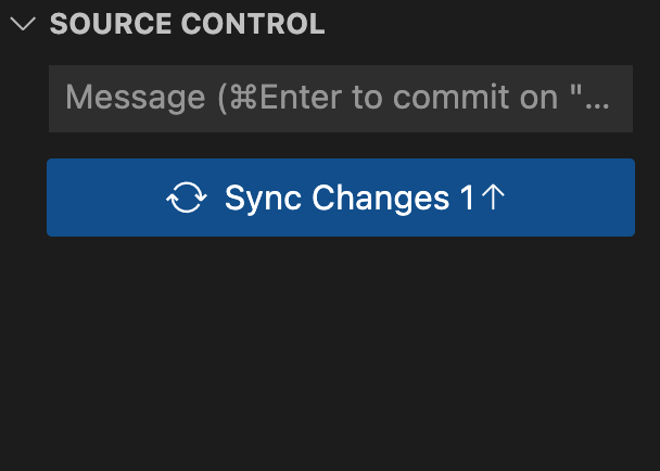 如下图所示,此时在 vscode 侧面板上,SOURCE CONTROL 类别下已清空,只出现了一个 sync changes 的按键,一旦我们点击此按钮,我们刚刚提交的变更就会发布到远程服务器上。