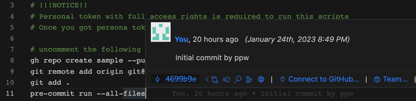 当 ppw 生成了框架代码之后,我们需要把它提交到 Github 上去。由于此时 Github 上还没有这个仓库,我们必须等用户手动创建,因此这个提交也没法自动化。当我们使用了 Github cli 之后,这个问题就解决了: