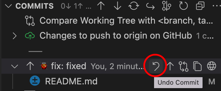 如果我们从图形界面上执行 reset 操作,大概分这么几步。首先,我们找到 COMMITS 面板,然后找到要重置的提交,点击它,选择"undo commit"操作,这相当于执行了一个”reset --soft HEAD~"操作。
