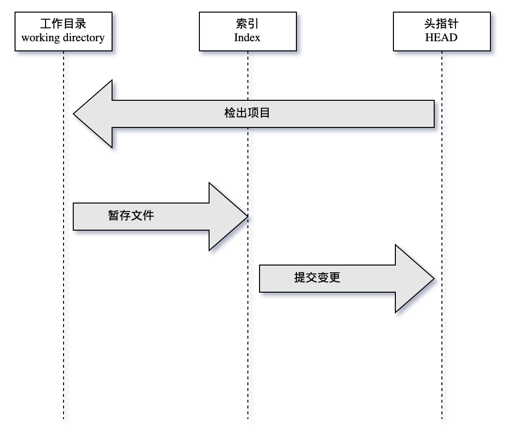 您已经注意到,我们将变更保存到 git 系统中的步骤不止一步。实际上,git 中的很多操作都是多阶段的,常常会经历一个修改(modified)、暂存(stagged),提交(committed)和推送(push)的过程。要理解这几个阶段,我们还得先深入介绍一下相关的三个基本概念:HEAD, index 和 working tree。