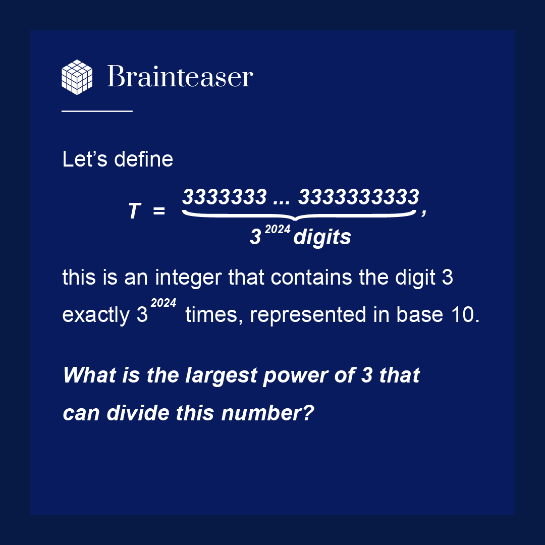 简单翻译一下,就是数字N由3^2024个3组成。要求找出这样一个数字,它是3的幂中,能整除N的最大的一个。如果我们缩小问题的规模的话,333, 333333333都是合适的N的取值,但3333,33333等则不是,而9, 27则是对应的满足条件的最佳答案。
