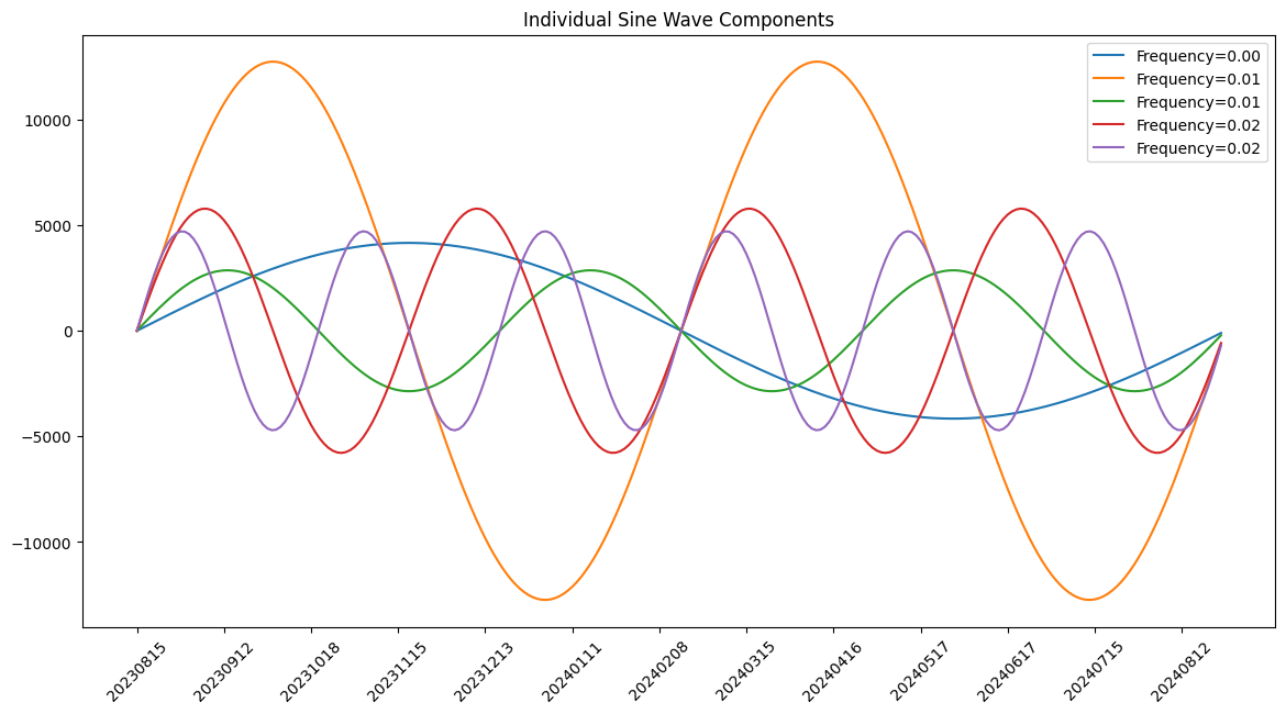 我们看到,对沪指走势影响最强的波(橙色)的周期是 7 个月左右:从峰到底要走 3 个半月,从底到峰也要走 3 个半月。由于它的能量几乎是其它波的一倍,所以它是主导整个叠加波的走势的:如果其它波与它同相,叠加的结果就会使得趋势加强;反之,则是趋势抵消。其它几个波的能量相仿,但频率不同。