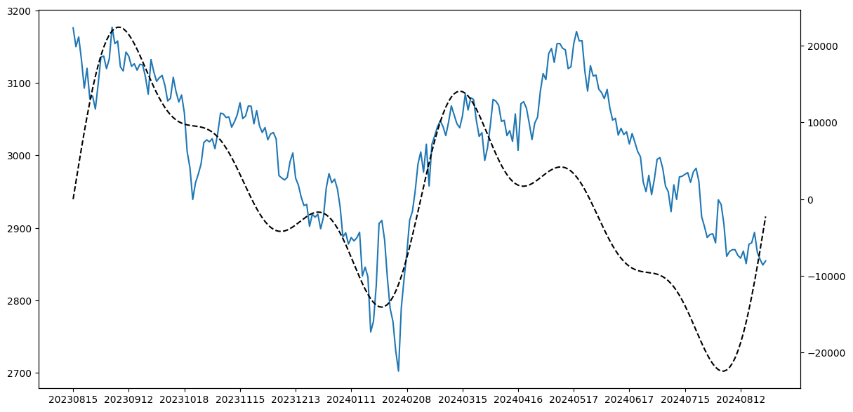 直到今天我突然涌现一个想法:如果你把一个较长的时序信号分段进行 FFT 分解,这样会得到若干个直流分量。这些直流分量的回归线才是资产价格的趋势。