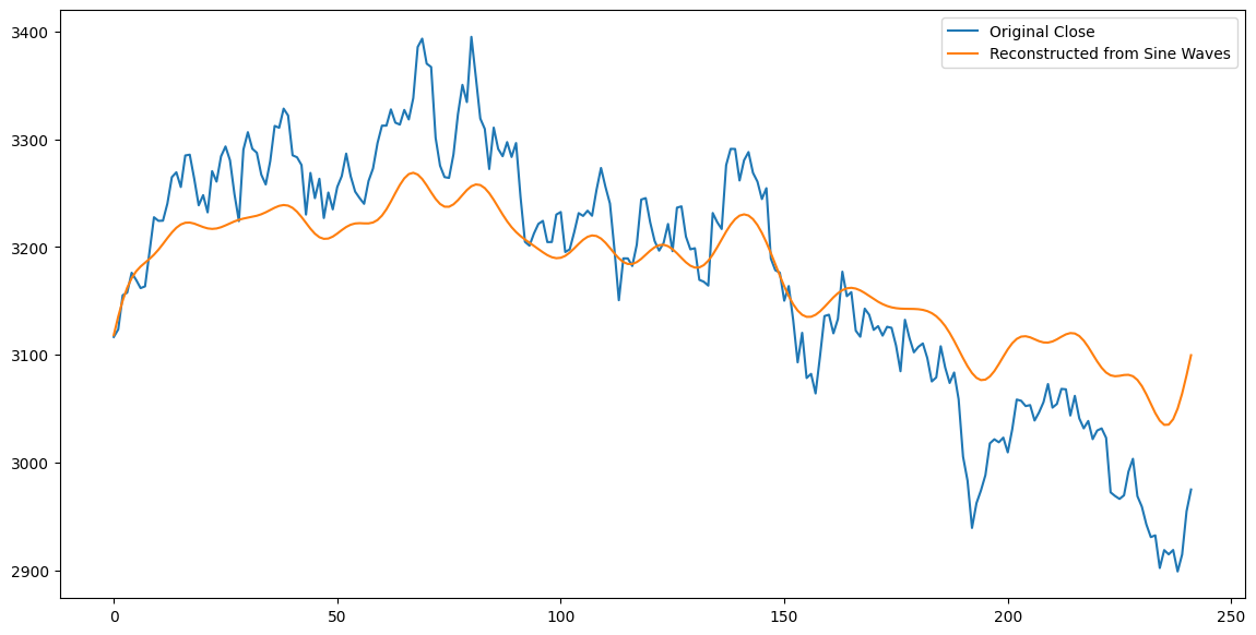我们已经取得了过去一年来的沪指。显然,它是一个时间序列信号。傅里叶变换正好可以将时间序列信号转换为频域信号。换句话说,傅里叶变换能将沪指分解成若干个正弦波的组合。