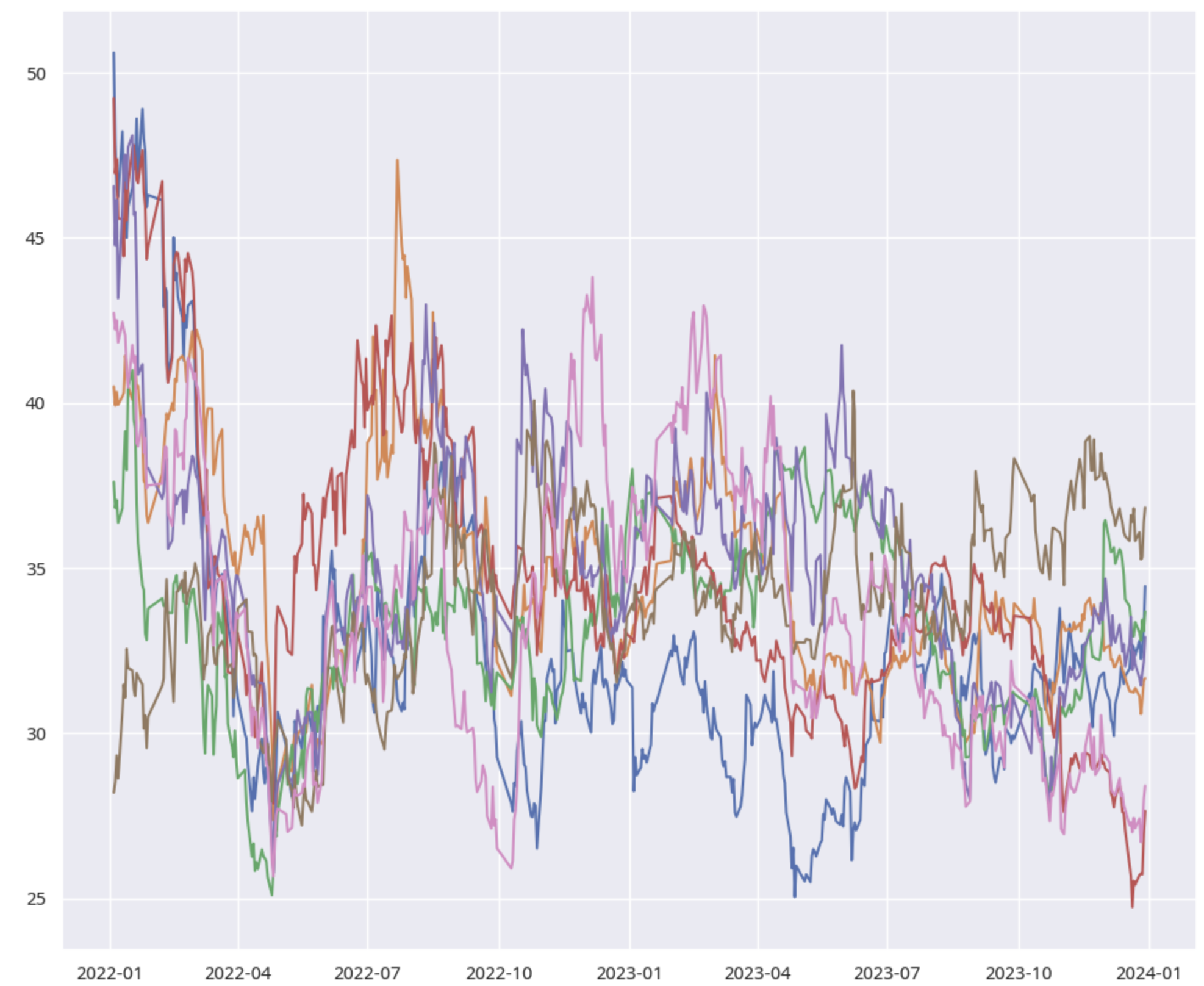 hdbscan 的聚类效果如何?我们能否在它划分的类别中,寻找到协整对呢?我们通过下面的代码来可视化簇类的样本走势,并执行协整检验。这是随机抽取的第 12 簇的情况: