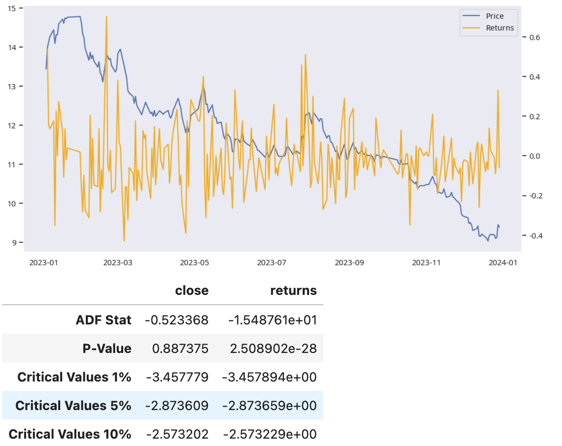 对量化人来说,资产价格序列和收益率是常见的两种时间序列。我们可以通过 Dickey-Fuller 检验来判断它们是否是平稳的: