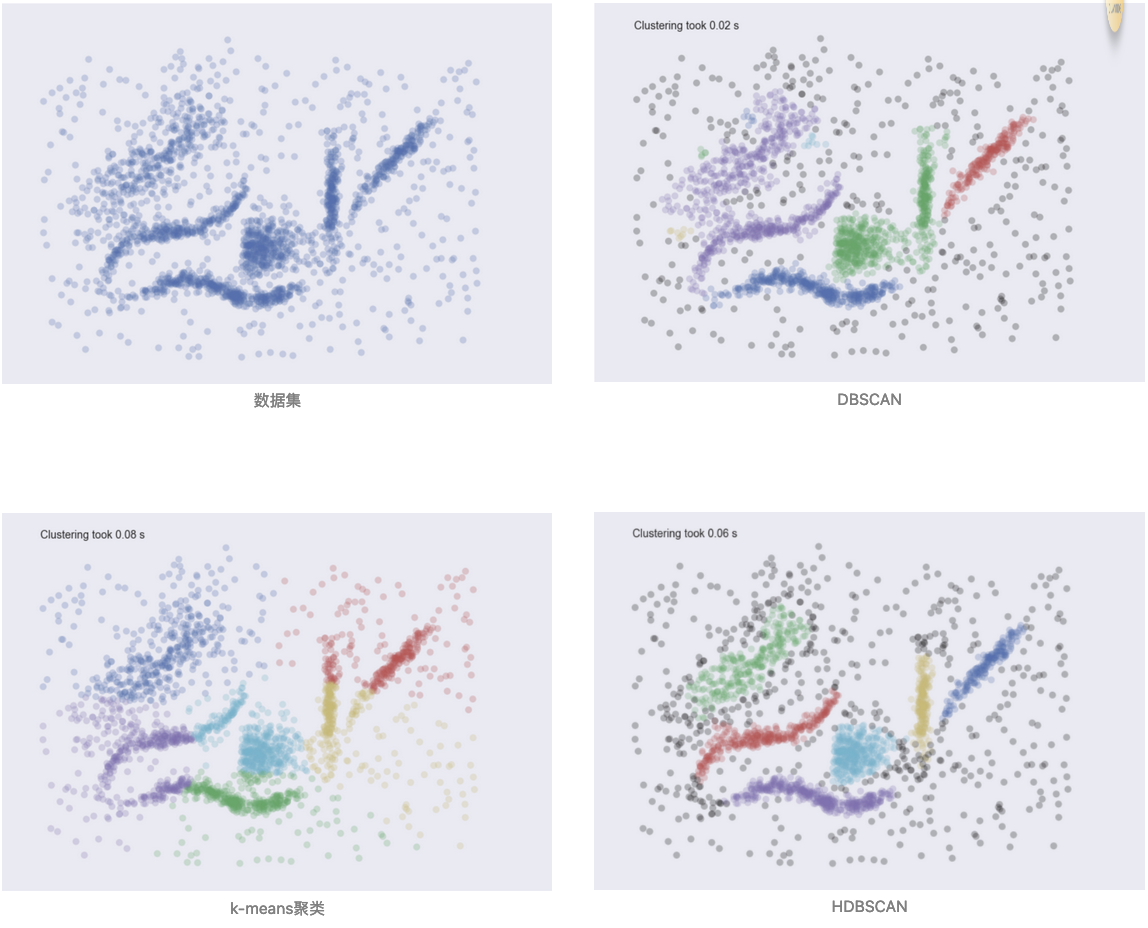 聚类算法有很多种,sklearn 中提到的就有 10 多种。不过,对通用目的而言,最好的聚类算法可能是 hdbscan。它不令速度快(仅次于 kmeans),而且能容忍噪声,并且超参数也很容易理解和设置。