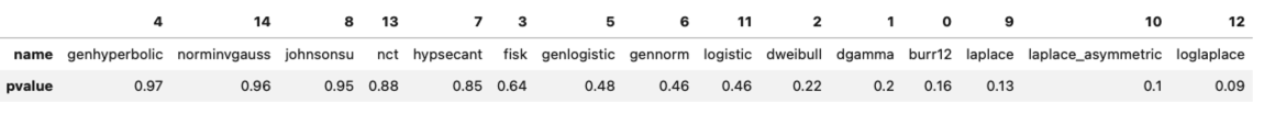 图可能有点宽,导致手机上没法看清楚。不过我们只要知道,这里的第一行,genhyperbolic,即广义双曲分布的 pvalue 最高,达到了 0.97。