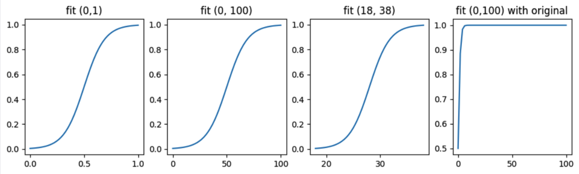在子图1中,我们让数据在[0,1]之间有最好的响应灵敏度。子图2中,如果数据经常落在50附近,正负50之间波动,也能得到最好的响应灵敏度。子图4则显示的是原始的sigmoid在[0,100]之间的取值情况。
