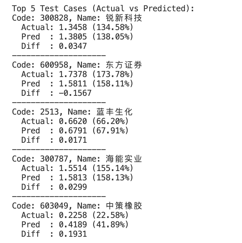 这个数据其实还是很不错的。像锐新科技,实际涨幅达到134.85%,预测误差只有4%左右,算是相当准确了。