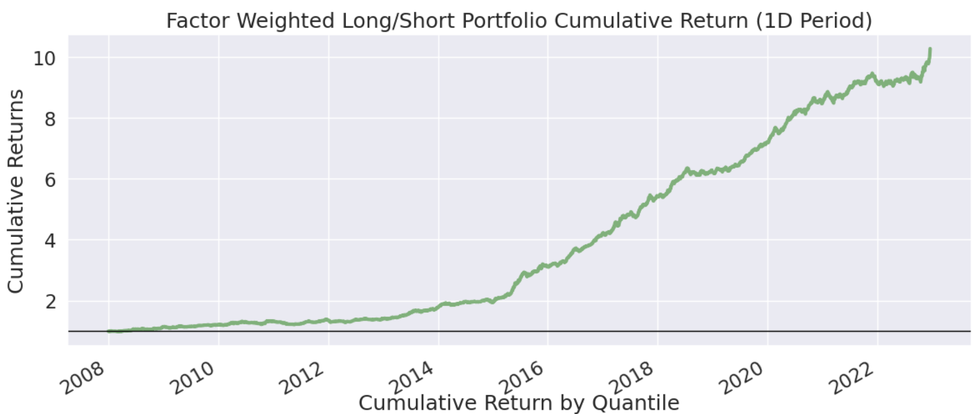 累积收益图也很完美。A股2008年触顶6124之后,持续下跌数年,但这期间此因子的收益仍然保持上涨。