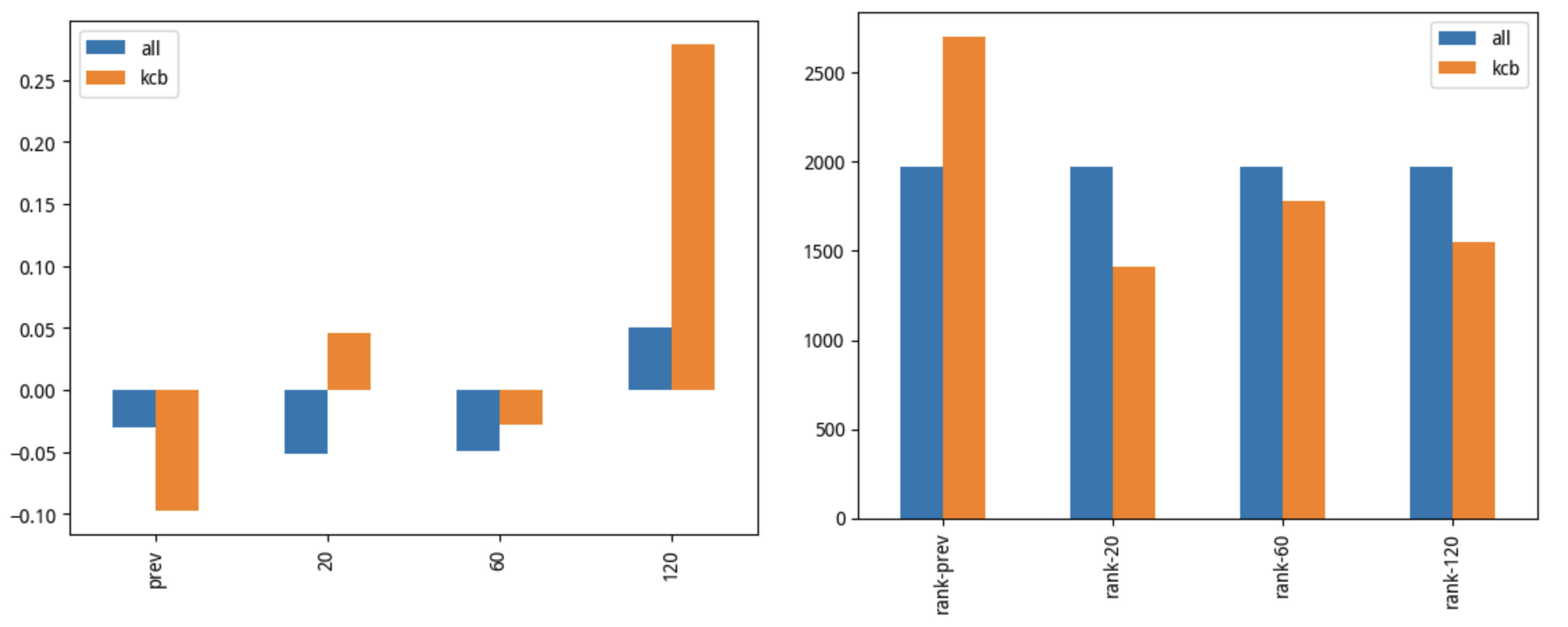 这样我们就得到了在 12 月 14 日这一天,所有个股的前一个月收益和远期收益及其排名。接下来,我们用当天进入中证 1000 的科创板个股筛选出一个子表,分别计算各项均值。