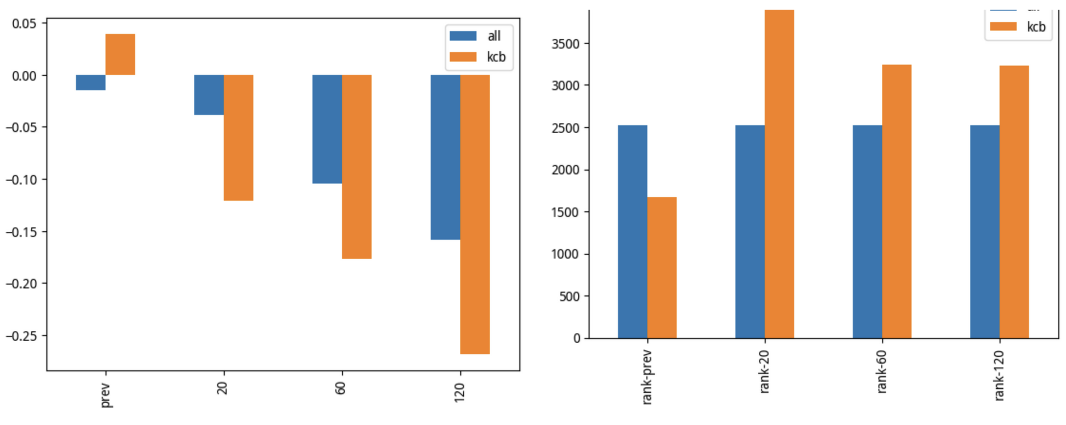 我们先看 2020 年 12 月 14 日,把这一天所有个股,从前一个月、到后 120 个交易日的行情数据取出,计算前一个月涨幅(prev),后一个月涨幅 ("20D")、后 60 个交易日涨幅 ("60D")、后 120 个交易日涨幅 ("120D"),分别对这些列进行排序,分别计为 rank_prev, rank_20, rank_60 和 rank_120。