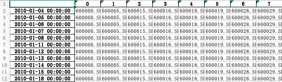 这里展示的是上证 50 的编制数据。这是一个 3000 多行,50 列的数据。索引是交易日,单元格值则是每个交易日成分股的代码。