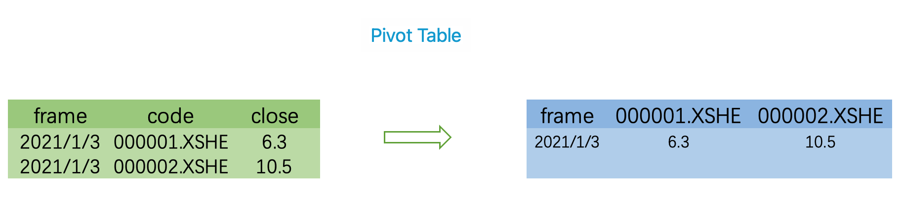 先将各个子 price frame 拼接起来,然后通过 pivot 函数,对表格进行转换,最终就得到上面的格式。这个转换如下图所示: