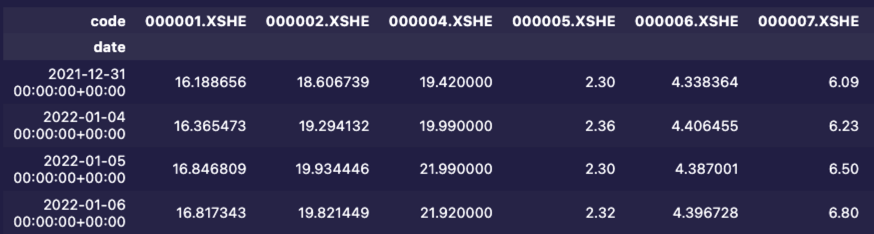 格式的要点是,它是以日期为索引,每个 asset 的代码为列的一个 dataframe,每一个 cell 的值则是当天某个 asset 对应的收盘价。