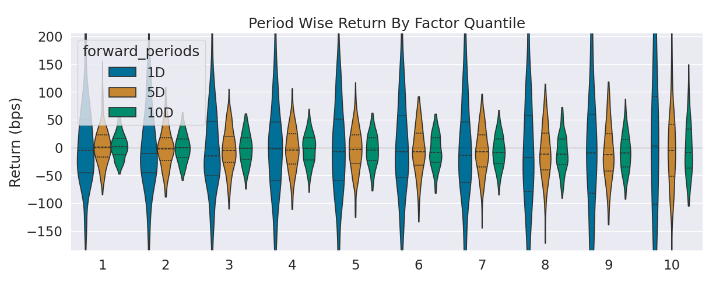 上例中我们指定了 quantiles=10,它是把每一天的因子数据从小到大排列后,按 len(df)/10 进行切分,即每个分片中,大致落入相等的因子记录(由于缺失值处理等原因,所以不会完全相等)。