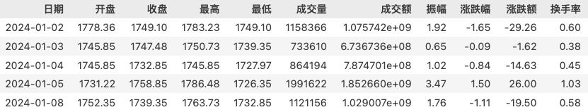 返回值有很多列,我们只关心日期、收盘和换手率这三项。这个 API 有一个 adjust 参数,即要求我们选择复权方式。在本例中我们使用 qfq 和 hfq 都没有任何区别,但是不能使用不复权数据。