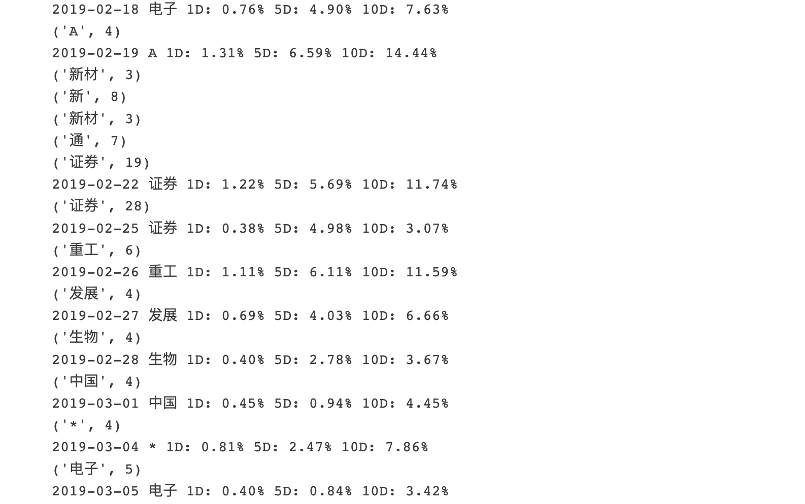 在处理过程中,我们就已经打印出了当日板块的1、5和10日未来收益(如果当天存在这种题材炒作的话),以便调试。另外,我们也返回这个收益结果,以方便进一步处理。