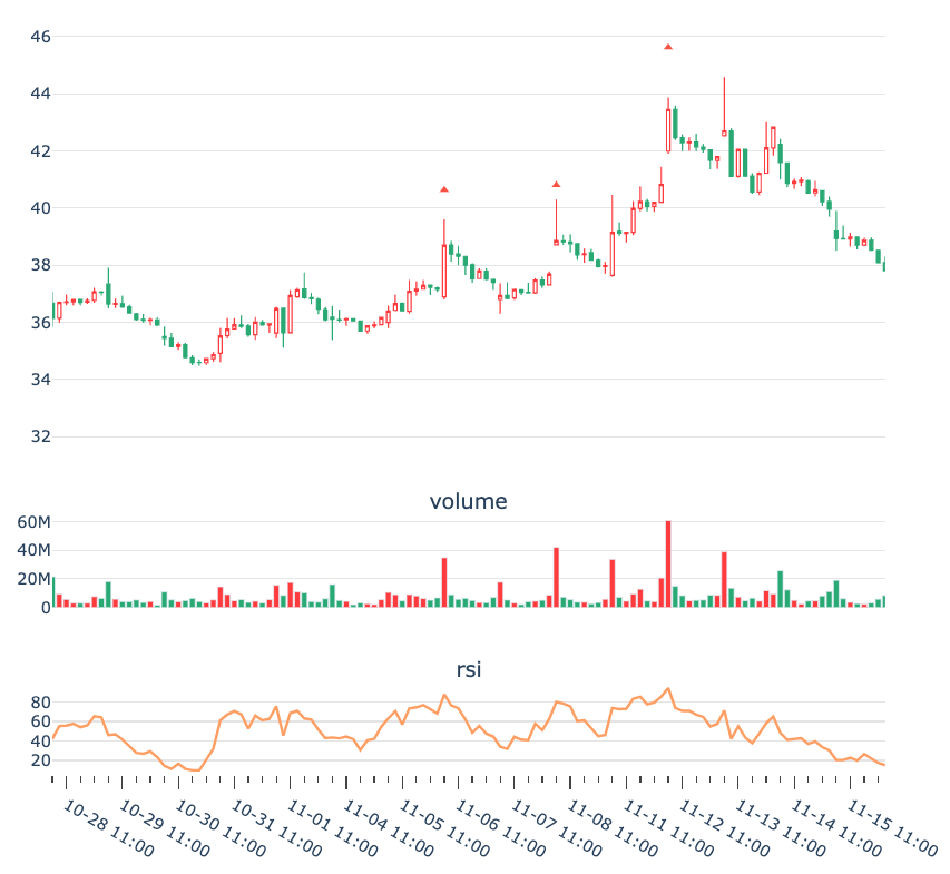由于akshare无法按时间段获取30分钟线,并且只能获取固定长度的30分钟线(更早的会丢弃)k线,所以,这段代码运行的结果将会与下图不同。