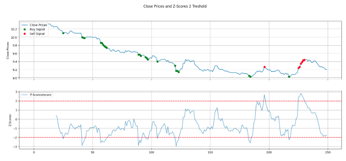 这篇笔记不打算走完整的流程,我们将随机选择一个标的,计算它最近 250 期的 zscore,把 zscore 小于-2 的点作为买入点,大于 2 的点作为卖出点,进行绘图显示,然后就图的走势,来进行深入讨论: