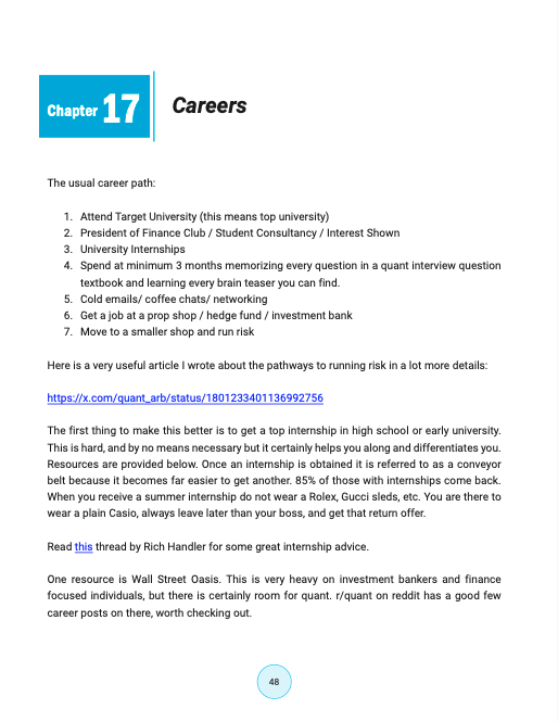 职业:介绍了量化交易的通常职业路径,包括就读顶尖大学、参加实习、学习面试问题等,并推荐了一些资源。