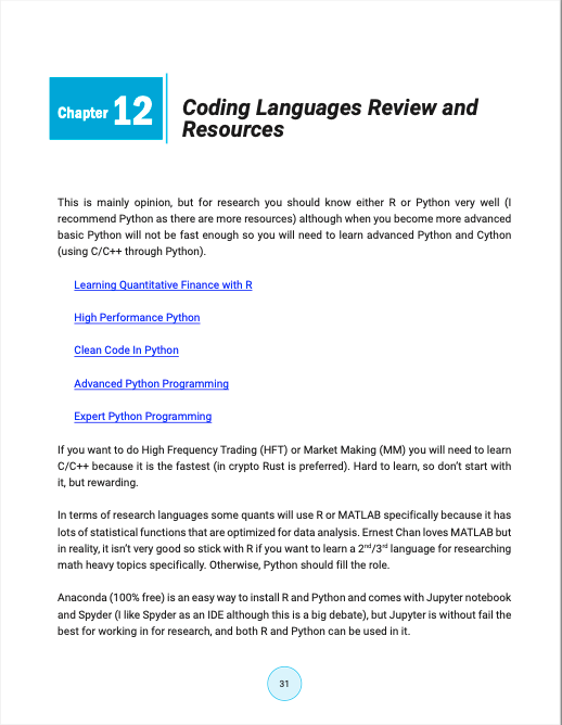 编码语言评论和资源:推荐使用 Python 进行量化交易研究,若想进行高频交易或做市,则需要学习 C/C++(在加密领域,Rust 更受欢迎)。