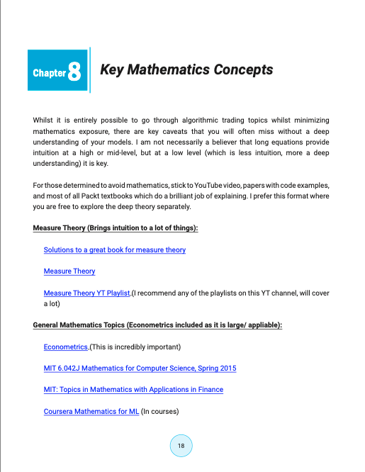 关键数学概念:强调了数学在算法交易中的重要性,推荐了一些学习数学的资源,如 Measure Theory、Econometrics、Stochastic Calculus、Probability Theory 等。