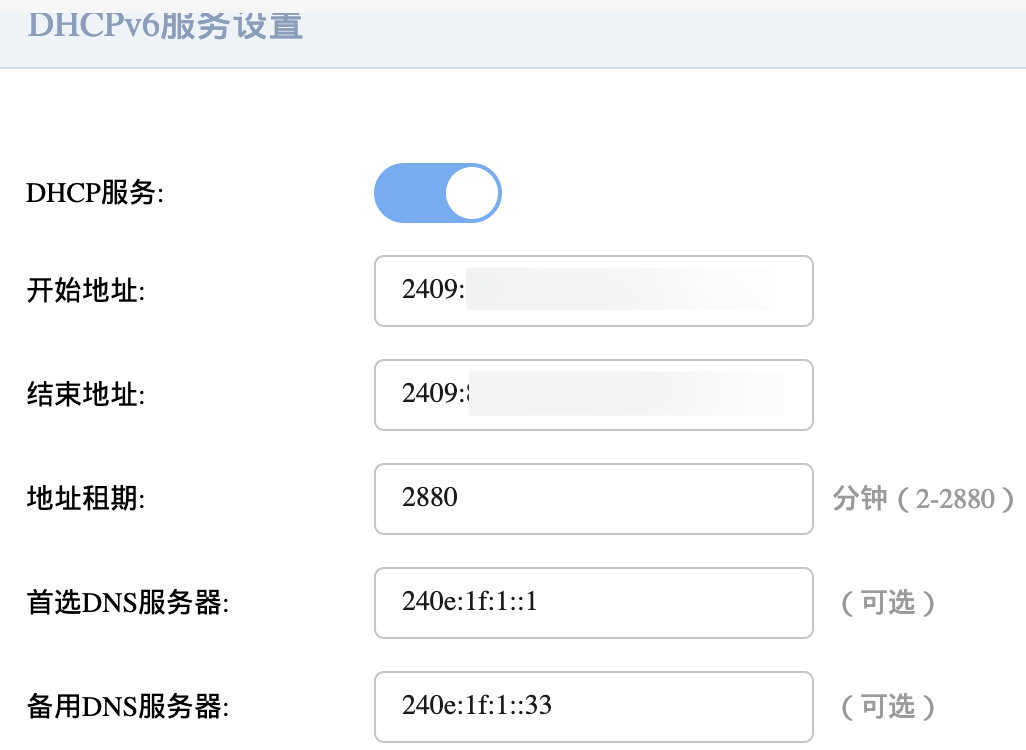 我们还要开启DHCPv6服务,并设置IPv6地址池,重点是设置DNS: