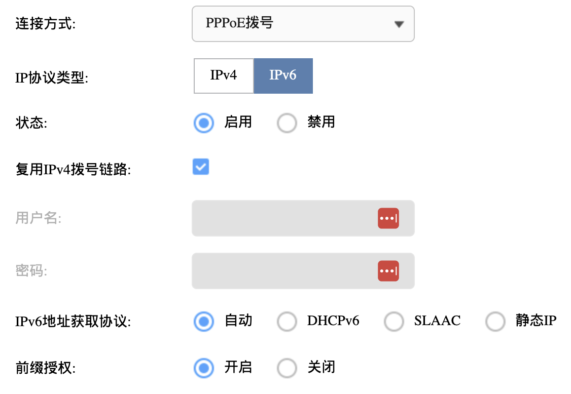 在WAN设置中,我们将连接方式改为PPPoE,并填写光猫的IP地址、用户名和密码。如果它同时提供了IPv4和IPv6两个选项,我们在IPv6中,选择启用,并且设置为复用IPv4拨号线路即可。其它的都保持默认。