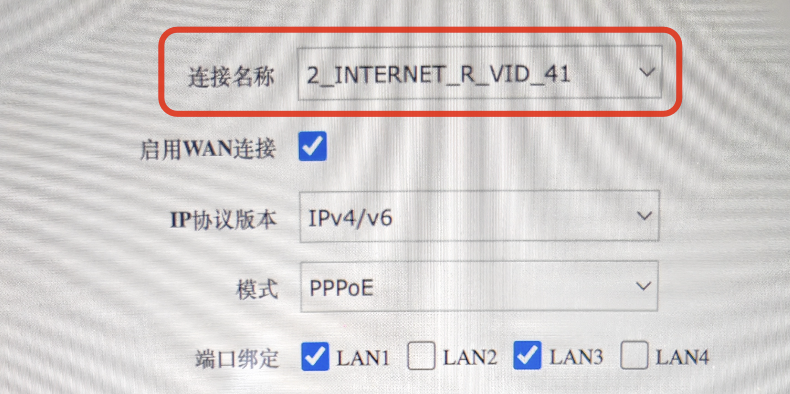 我们要修改的正是红框内的连接,而不是其它连接。当前它的连接方式是PPPoE,一般来说,其它模式,比如桥接,也会在这个单选框下。另外,IP协议版本这里要注意,一定要选择IPv4/IPv6。