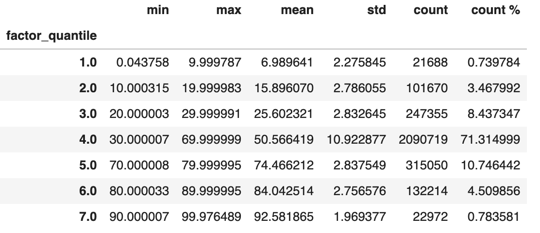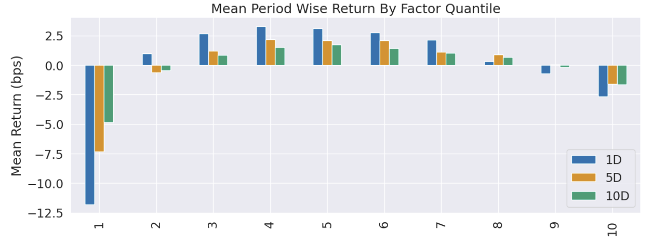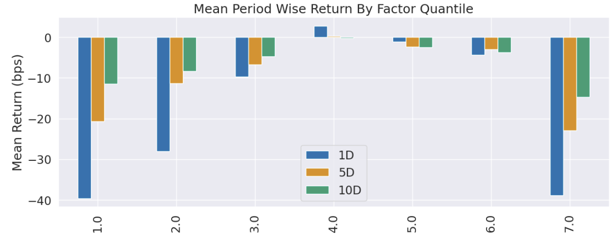Alphalens提供另一种分层方式,即by bins。我们提供的分箱是[0,10,20,30,70,80,90,100]。这里我们有一个假设,即我们对中间的RSI不感兴趣,认为它们不会提供交易信号。