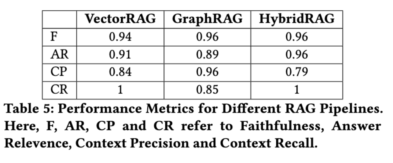 GraphRAG 在上下文精确度方面表现出色,得分为 0.96,而 HybridRAG 在上下文召回方面保持了强劲的表现,与 VectorRAG 一起获得了 1.0 的满分。这些结果强调了 HybridRAG 在提供准确、上下文相关的响应,同时平衡基于矢量和基于图形的检索方法的优势方面的优势。