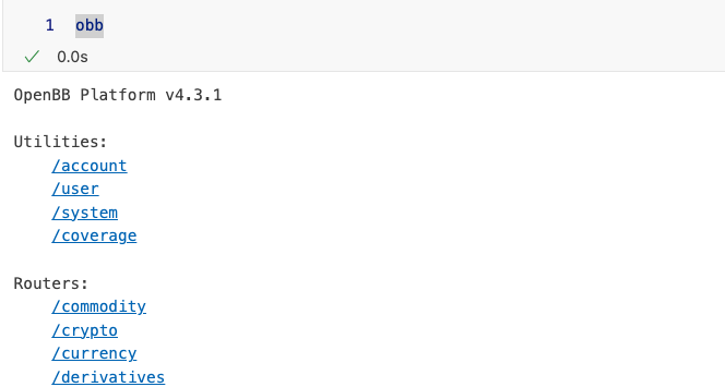 这个 obb 对象,就是我们使用 openbb 的入口。当我们直接在单元格中输入 obb 时,就会提示我们它的属性和方法: