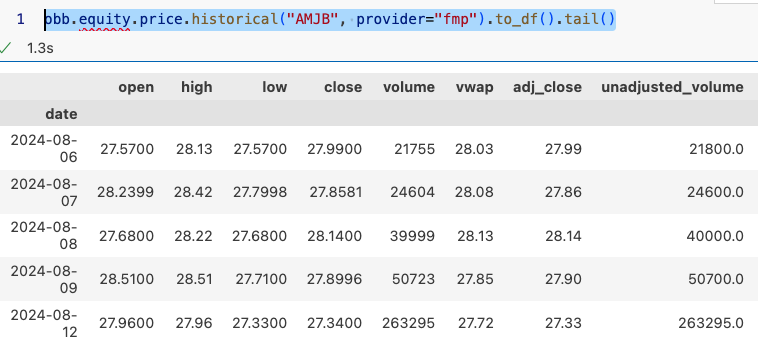 我们从刚才的结果中,得知小摩(我常常记不清 JPMorgan 是大摩还是小摩。但实际上很好记。一个叫摩根士丹利,另一个叫摩根大通。大通是小摩)的股票代码是 AMJB(名字是 JPMorgan Chase 的那一个),于是我们想查一下它的历史行情数据。如果能顺利取得它的行情数据,我们的教程就可以结束了。